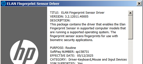 ELAN WBF Fingerprint Driver - Официальный набор драйверов для сканера отпечатка пальца на чипах компании ELAN. Драйверы рекомендуются для ноутбуков HP и предназначены для работы в операционных системах Windows 11, Windows 10 64 бит.